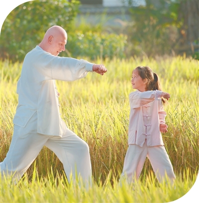 黟县阿琳娜花园民宿门前,民宿主理人阿明(左)和女儿阿琳娜在打太极。