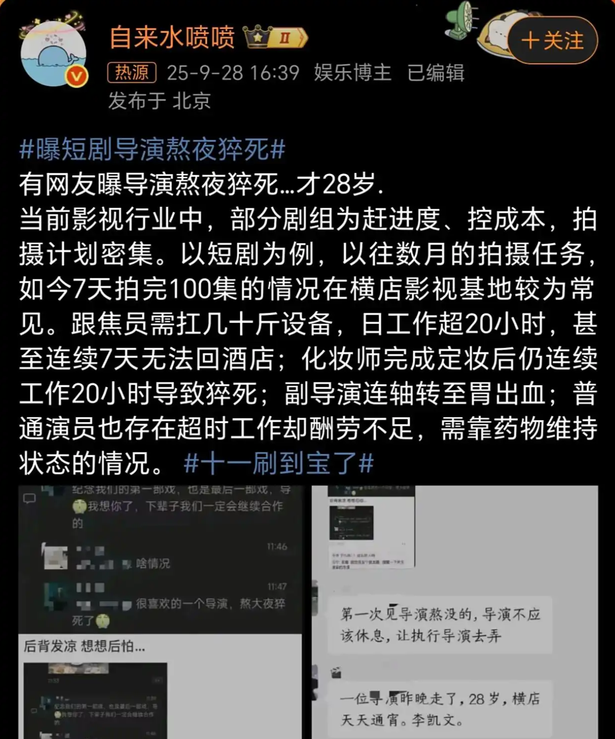 一个是今年8月份,28岁导演猝死在短剧片场。消息来自演员戴娇倩在社交平台的爆料“最近跟化妆间的朋友聊天,聊着聊着就难受起来,有导演连续工作7天,一躺下去人就没了。”据悉事发地为杭州,当时气温高达38度,剧组正值拍摄关键期,导演连续7天驻守现场,每天工作超过18小时。现场工作人员透露“他最后三天几乎没合眼,困了就灌冰咖啡,累得靠在椅子上都能睡着。”
