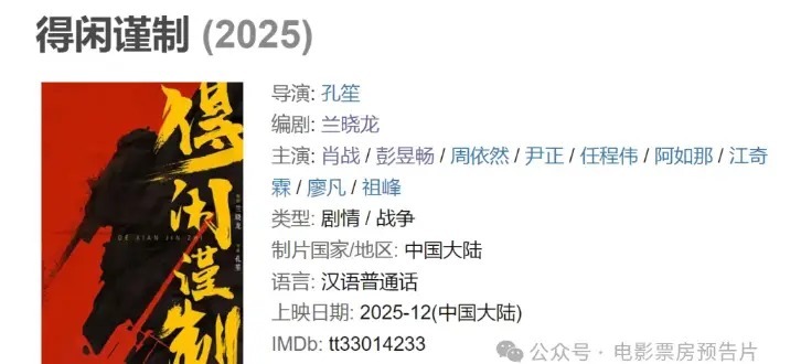 贺岁档还未正式启幕,影坛就迎来重磅对决——正午阳光首部电影《得闲谨制》传出定档消息,直接与郭富城新片正面交锋。这部手握孔笙、兰晓龙黄金班底,肖战领衔的抗战题材作品,不仅提前锁定豆瓣最受期待榜单,更被业内预测票房冲击20亿,无疑是今年年末的"王炸选手"。