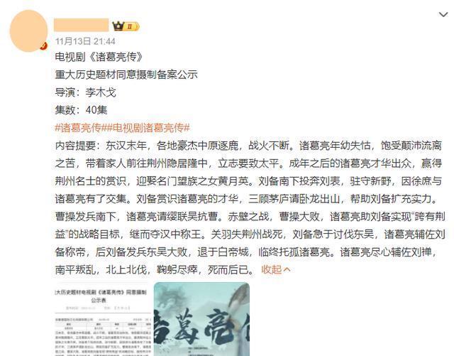 唯一让人担忧的,是作品的完成度。 从故事梗概来看,几乎将诸葛亮生平经历的历史事件全都涵盖其中。 三顾茅庐、赤壁之战、刘备托孤,如果放在40集的体量中,显然要做出取舍,势必有一部分情节要被简化。