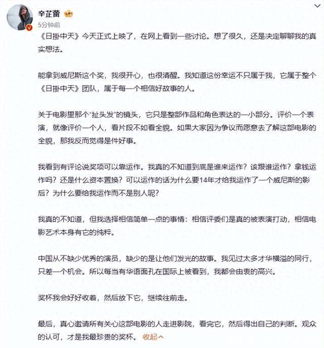 11月7日,辛芷蕾威尼斯影后之作《日掛中天》正式上映。 同日,辛芷蕾在社媒发文: 《日掛中天》今天正式上映了,在网上看到一些讨论。想了很久,还是决定聊聊我的真实想法。 能拿到威尼斯这个奖正规配资平台,我很开心,也很清醒。我知道这份幸运不只属于我,它属于整个《日掛中天》团队,属于每一个相信好故事的人。 关于电影里那个“扯头发”的镜头,它只是整部作品和角色表达的一小部分。评价一个表演,就像评价一个人,看片段不如看全貌。如果大家因为争议而愿意去了解这部电影的全貌,那我反而觉得是件好事。 我看到有评论说奖项可以靠运作。我真的不知道到底是谁来运作?该跟谁运作?拿钱运作吗?还是什么资本置换?可以运作的话为什么要14年才给我运作了一个威尼斯的影后?为什么要给我运作而不是别人呢? 我真的不知道,但我选择相信简单一点的事情: 相信评委们是真的被表演打动,相信电影艺术本身有它的纯粹。 中国从不缺少优秀的演员,缺少的是让他们发光的故事。我见过太多才华横溢的同行,只差一个机会。所以每当有华语面孔在国际上被看到,我都会由衷的高兴。 奖杯我会好好收着,然后放下它,继续往前走。 最后,真心邀请所有关心这部电影的人走进影院,看完它,然后得出自己的判断。观众的认可,才是我最珍贵的奖杯。